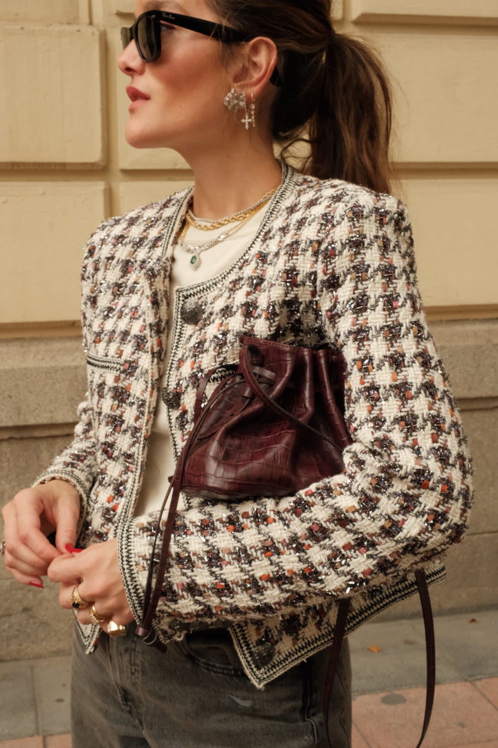 Together with SisterlyStyle, we have reinterpreted our iconic bucket silhouette to create a classic and functional piece. LE SAC in wine-colored leather with crocodile texture is an essential and versatile piece, perfect for day and night, as a crossbody, handbag, or clutch.