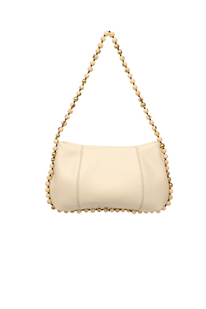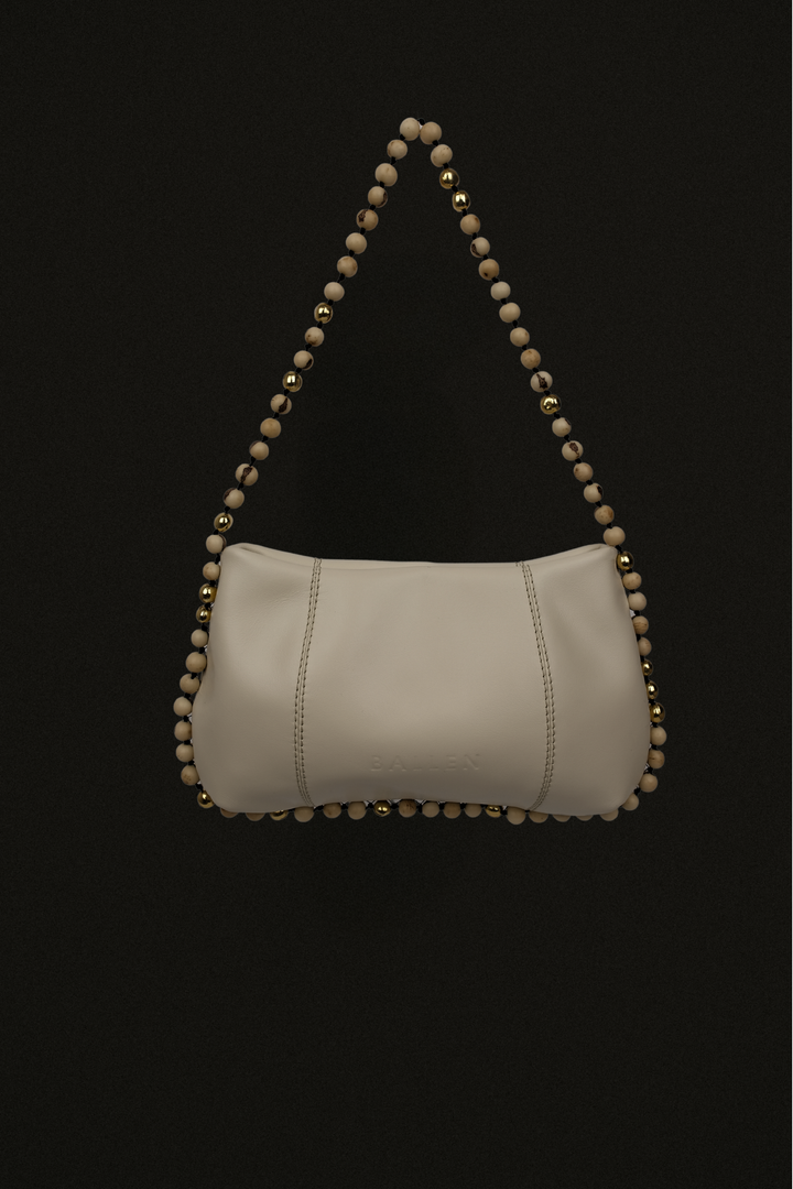 An unstructured bag for day and/or night with a magnetic top closure and strap made from reused ACAI seeds, which have now been transformed for the Alhaja collection with a gold coating that enhances their natural origin with a touch of light and sophistication.